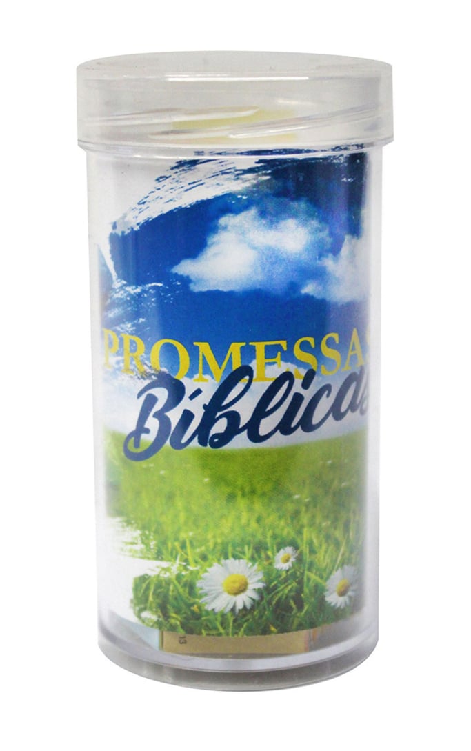Pote em acrílico contendo 120 promessas bíblicas em papel, para leitura aleatória ou para ser entregue a outras pessoas como forma de encorajamento.